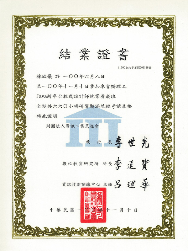 資策會 Java 跨平台程式設計師就業養成班 59 期 結業證書