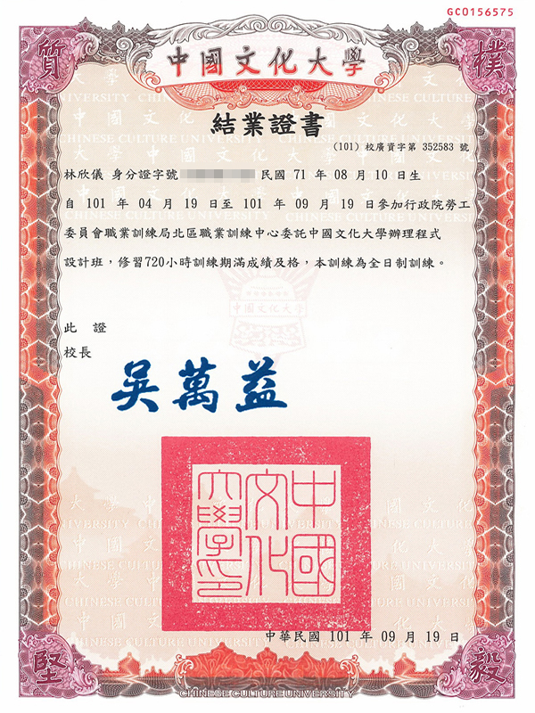 勞委會職訓局北區職業訓練中心 程式設計班 101 年 結業證書